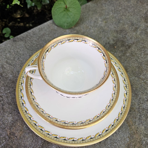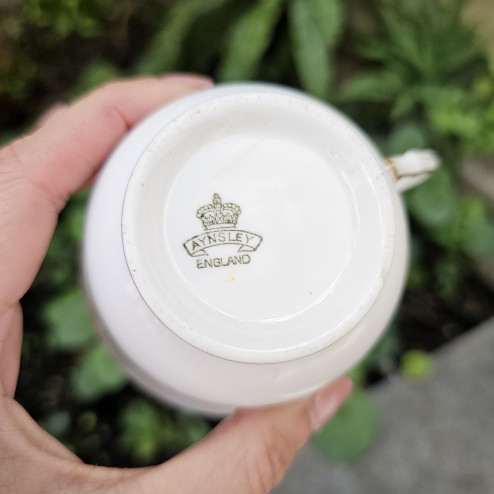 Raffinata tazza da tè con doppio piattino in porcellana fine bone china prodotta in Inghilterra dalla storica manifattura Aynsley tra gli anni ’20 e ’30 del Novecento.