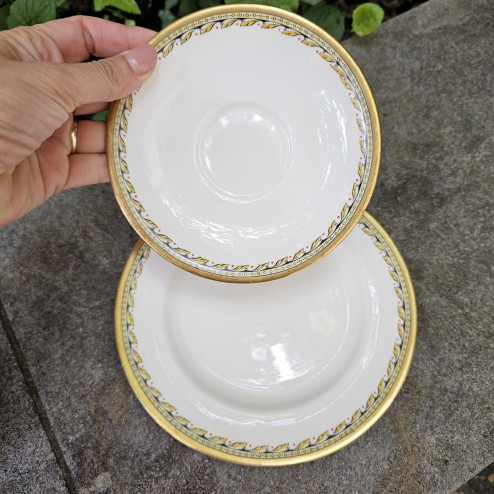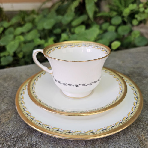 Composto da tazza, piattino e piatto da dolce in porcellana decorata a mano con profili dorati. Ottime condizioni.