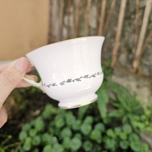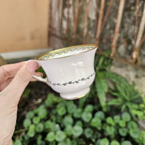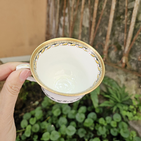 La forma della tazza è elegante e leggermente svasata, con profilo sottile e manico delicato tipico delle produzioni in fine bone china di alta qualità.