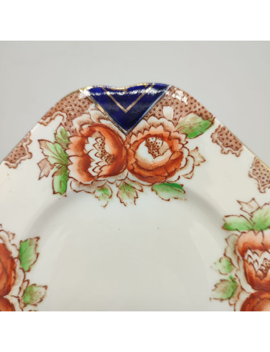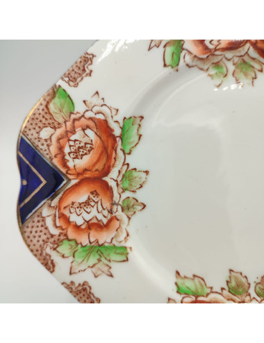 Il pattern è particolarmente grazioso, e mescola grandi fiori rossi (papaveri?) e decori geometrici in blu cobalto. Il tutto è illuminato da filettature in oro.