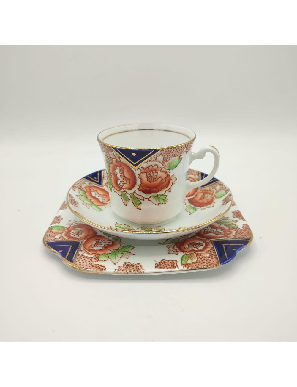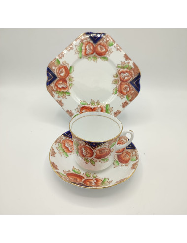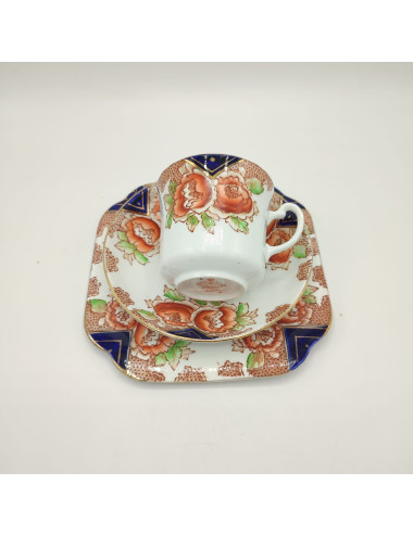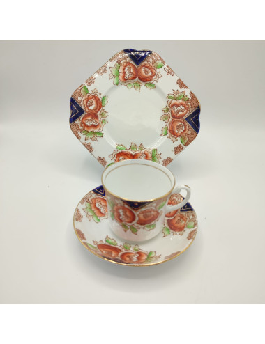 La sottile porcellana bone china è decorata da un vivace decori di fiori rossi e triangoli blu cobalto. filettature dorate illuminano il tutto.