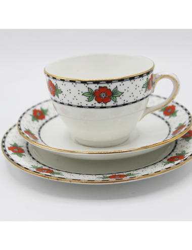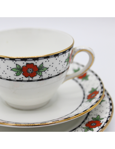 Raffinato trio da tè inglese in porcellana decorata a mano, prodotto da Wild Bros tra il 1904 e il 1916. Pattern "Haig", in stile Imari, con ricchi motivi floreali e bordi blu cobalto.