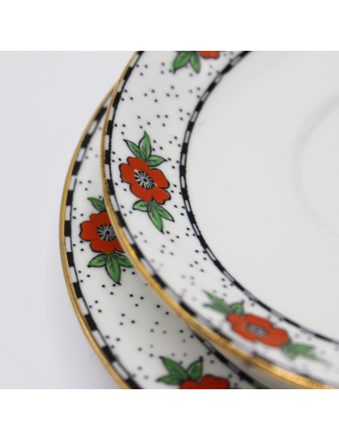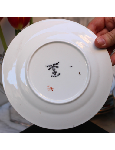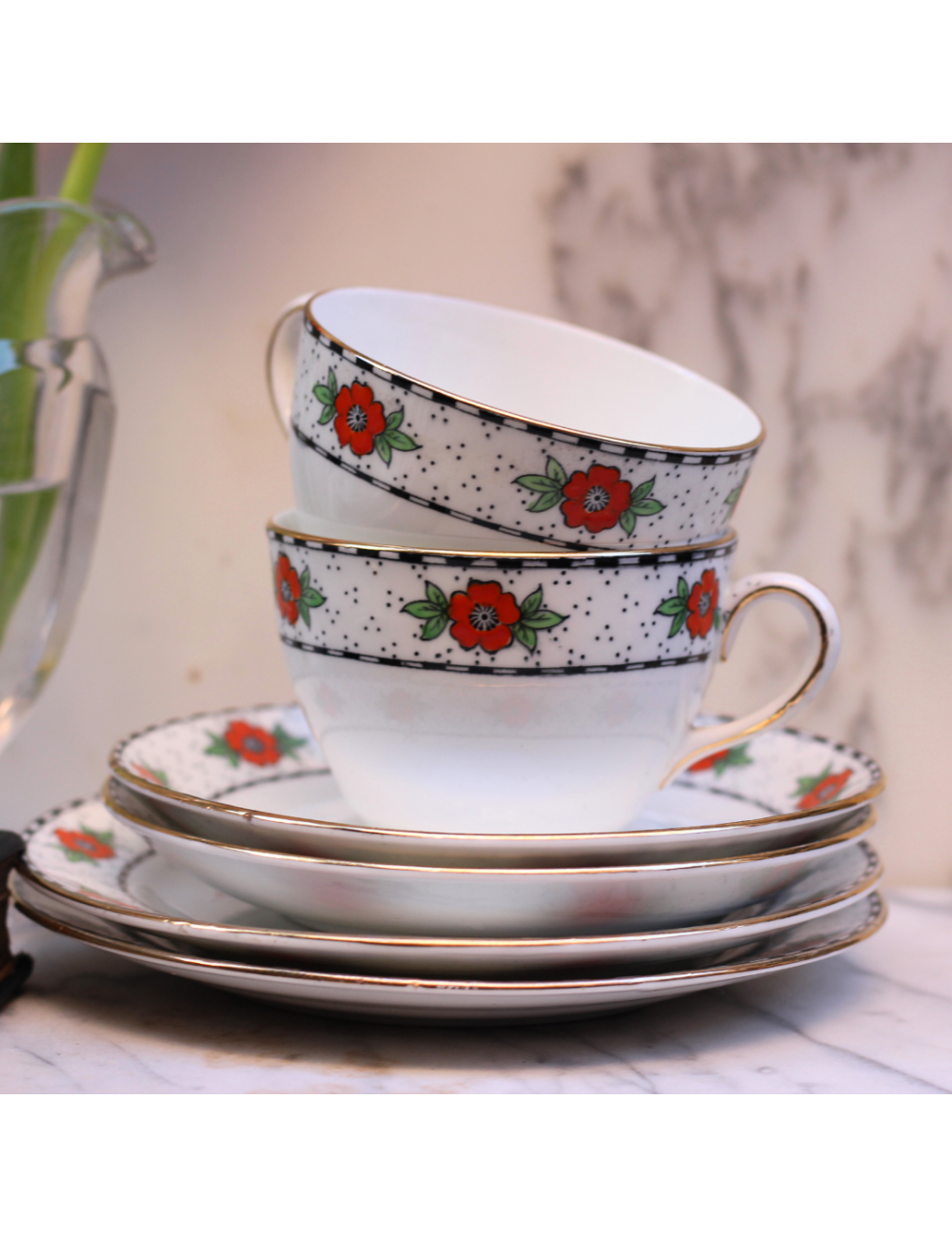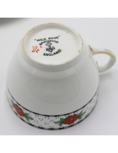 Eleganti tazze in porcellana inglese Anni ‘20 Bone China prodotte da Bridgwood & Sons. Ogni tazza è composta dal suo doppio piattino. Il decoro Wild Rose riprodotto su candida porcellana bone china è formato da piccole roselline stilizzate rosse. Le tazze si presentano con filettatura in oro.