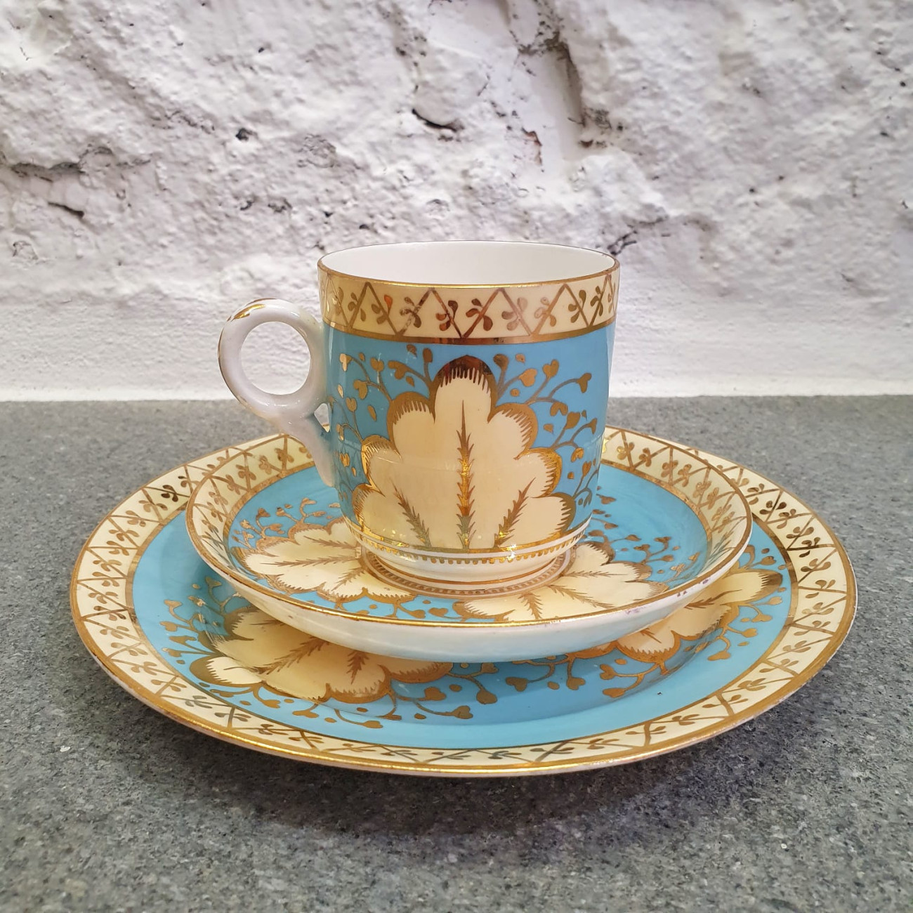 Tazza con piattino inglese in porcellana fine bone china, realizzata da Samuel Alcock & Co. intorno al 1840. Elegante decoro dipinto a mano in blu cobalto, oro e motivi floreali. Pezzo da collezione con alcuni segni del tempo (visibili nelle foto)