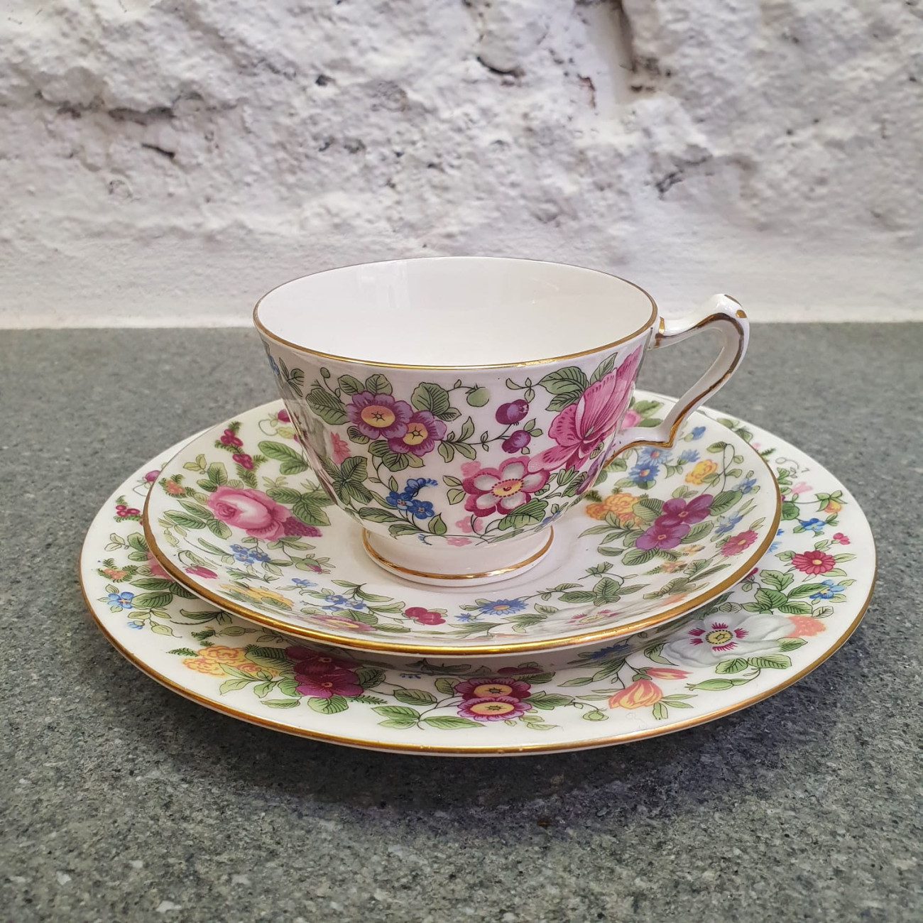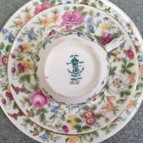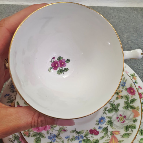 Ogni dettaglio racconta la maestria artigianale della porcellana inglese di inizio Novecento: la forma sinuosa della tazza, il manico sagomato, la brillantezza della bone china e il decoro floreale dai toni romantici.