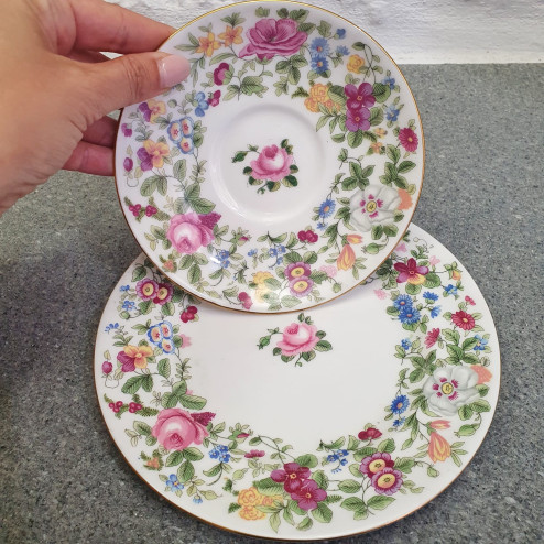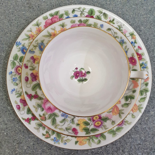 Questo raffinato trio da tè in fine bone china è stato prodotto da Crown Derby, una delle più celebri manifatture inglesi, ed è accompagnato da numero di registro risalente al 1913. Il set comprende una tazza e due piattini coordinati, ciascuno decorato con un ricco motivo di fiori colorati realizzati in transferware, arricchito da un filo dorato dipinto a mano sul bordo.