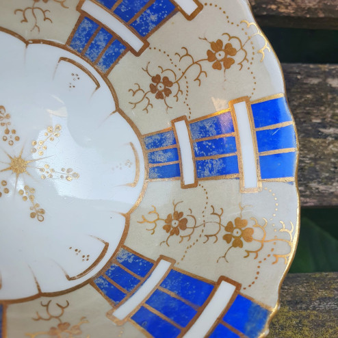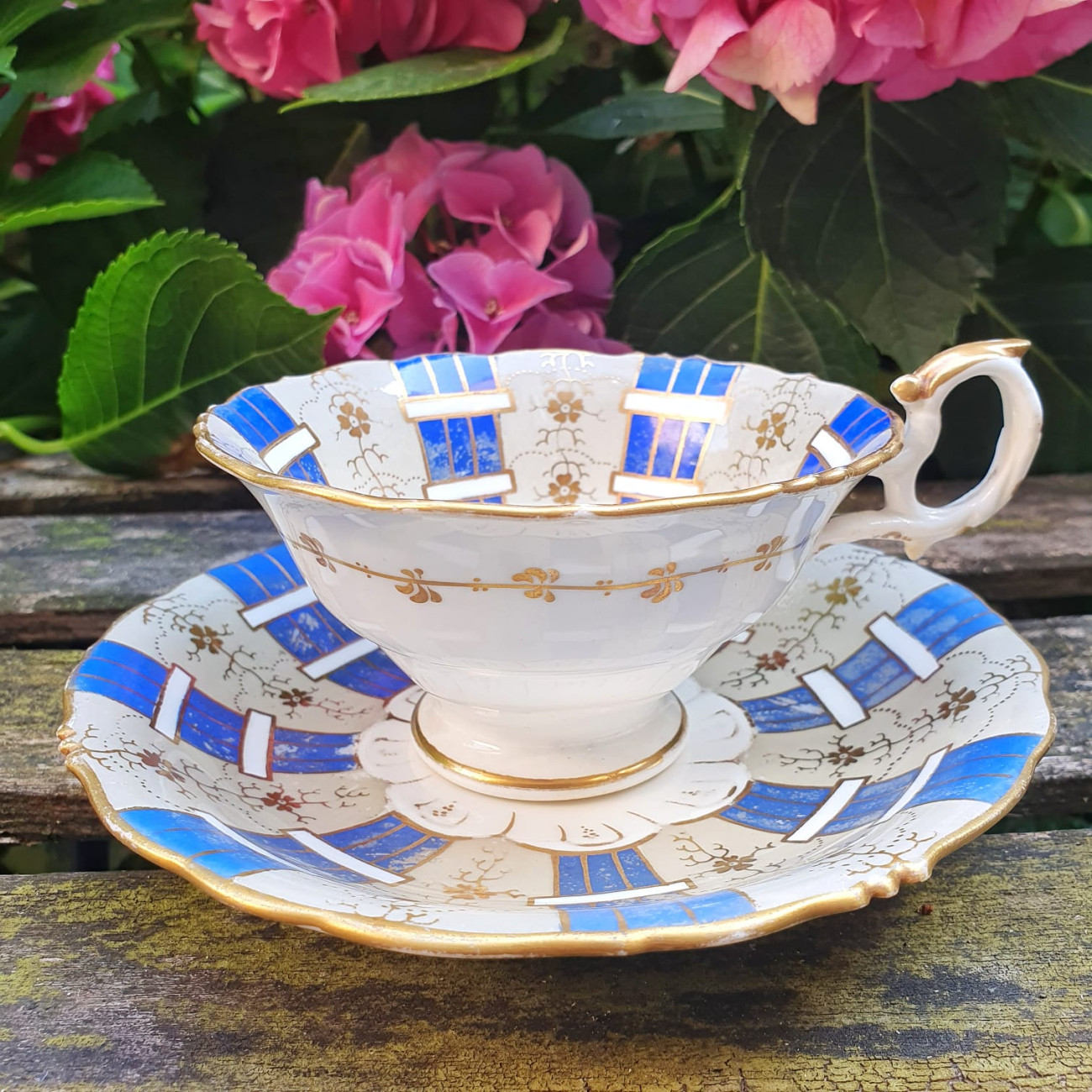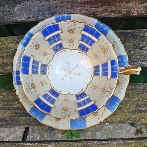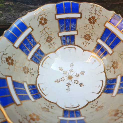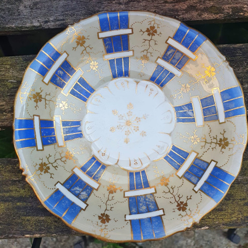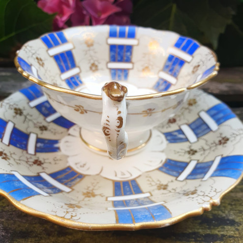 Tazza con piattino inglese in porcellana fine bone china, realizzata da Samuel Alcock & Co. intorno al 1840. Elegante decoro dipinto a mano in blu cobalto, oro e motivi floreali. Pezzo da collezione con alcuni segni del tempo (visibili nelle foto)