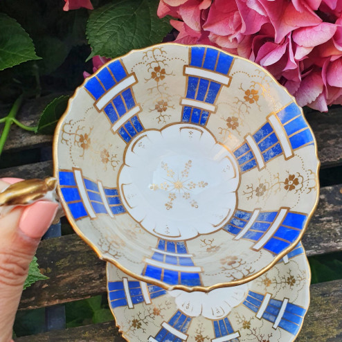 Elegante tazza con piattino in porcellana fine bone china, realizzata in Inghilterra da Samuel Alcock & Co. intorno al 1840. Questo raffinato set da tè è decorato a mano con motivi floreali dorati, elementi geometrici in blu cobalto e profili in oro.