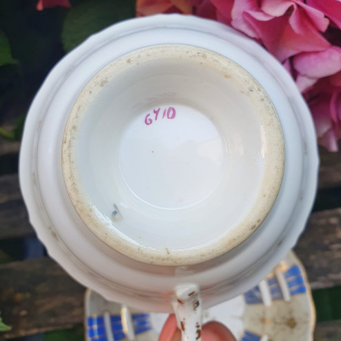 La tazza presenta un elaborato manico decorato anche in rilievo e poggia su un piede sagomato. Il piattino è coordinato, con bordi ondulati e lo stesso decoro armonico. Alcuni lievi segni del tempo confermano l’autenticità e l’età del pezzo, che resta in buone condizioni generali.