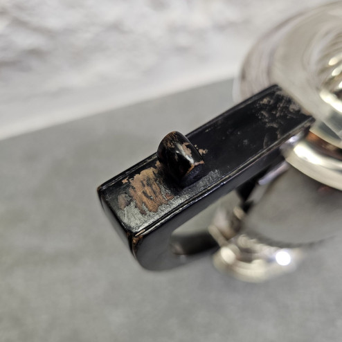 Il corpo in Sheffield plate conserva ancora oggi una bella brillantezza, e riporta su un lato un raffinato monogramma inciso a mano, che ne racconta la storia come oggetto personale o da dono.
