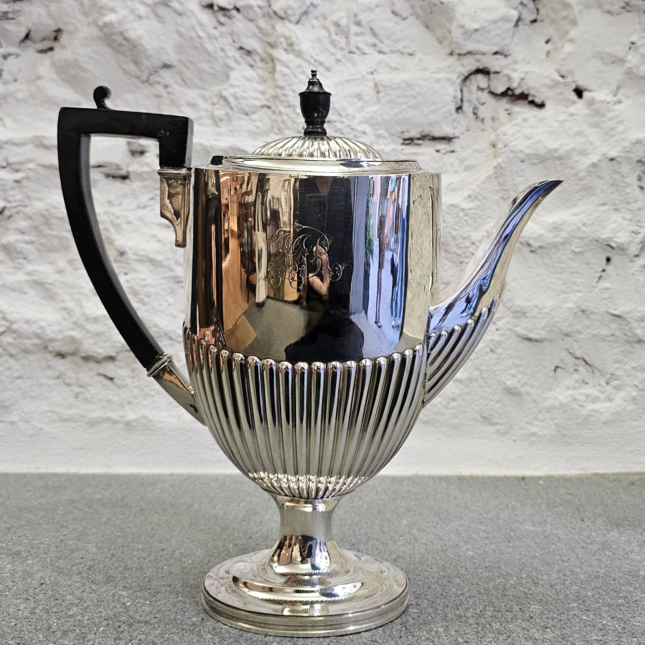 Elegante teiera inglese in Sheffield plate, realizzata tra il 1900 e il 1910 dalla storica manifattura Daniel & Arter, attiva a Birmingham e nota per la qualità dei suoi argenti. Questo modello si distingue per le proporzioni alte e slanciate, con corpo a calice su base circolare a gradini, impreziosito da una decorazione a scanalature verticali (fluted) ispirata allo stile Queen Anne.