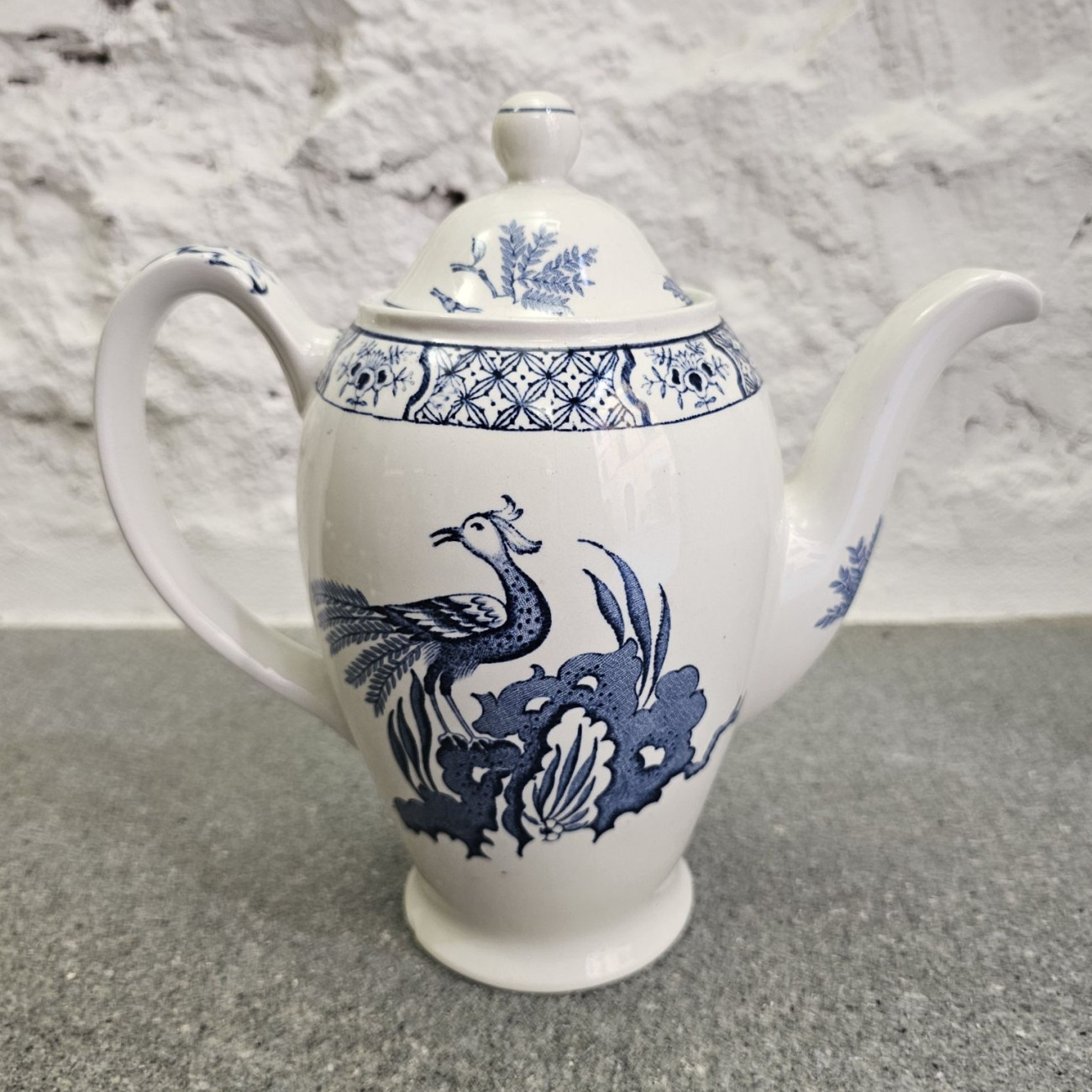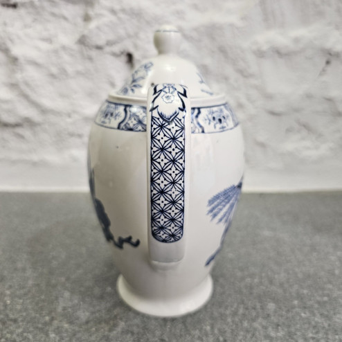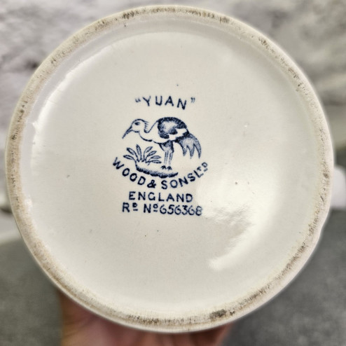 Elegante teiera (o caffettiera) in ceramica smaltata bianca, realizzata da Wood & Sons Ltd in Inghilterra negli anni ’50. Il pezzo presenta una graziosa forma ovale e il celebre decoro blu "Yuan", uno dei motivi più longevi e amati del marchio.