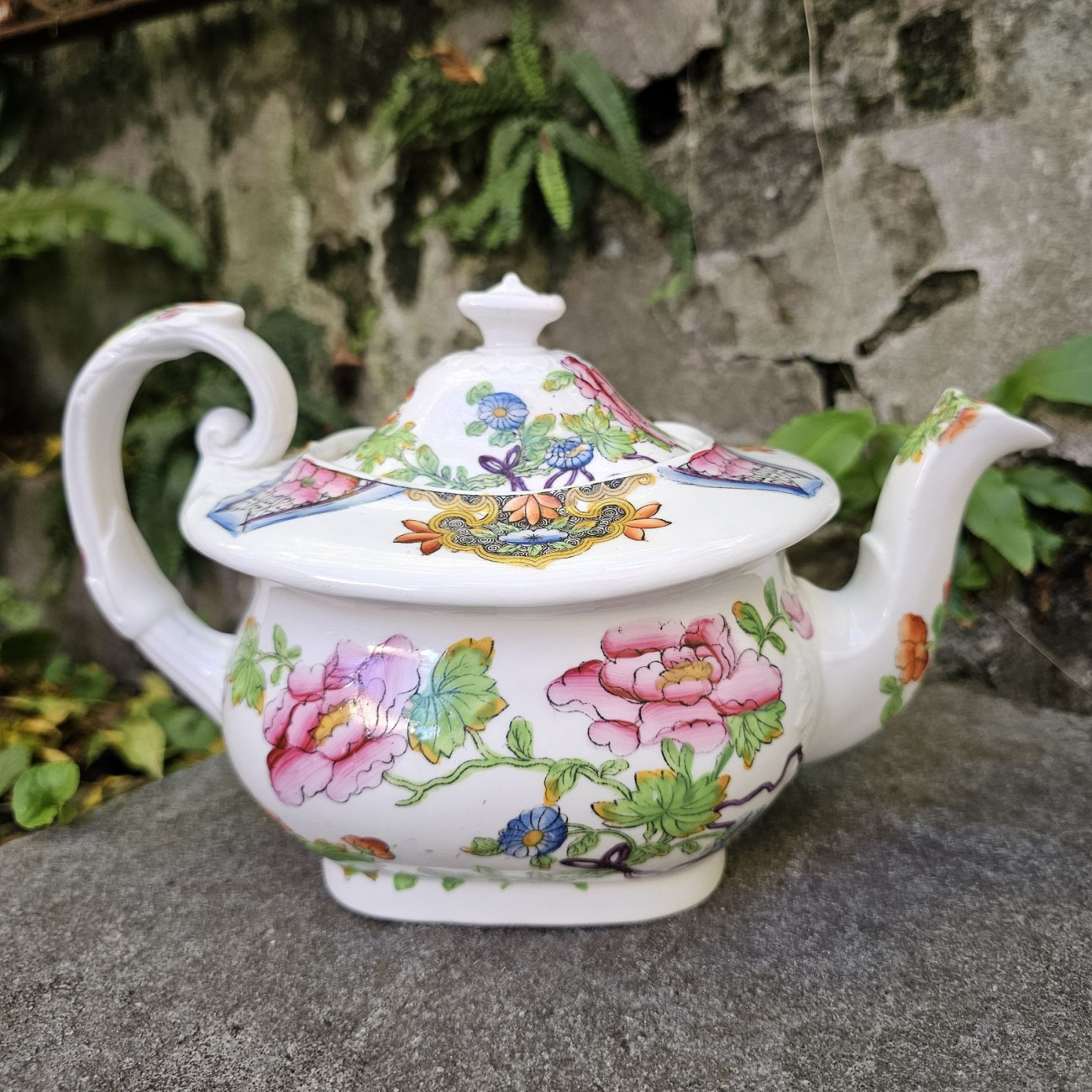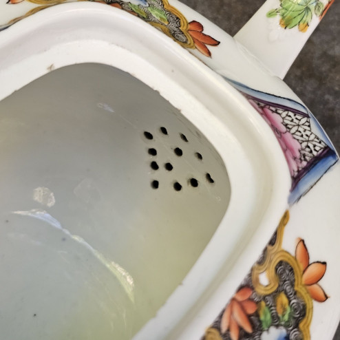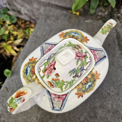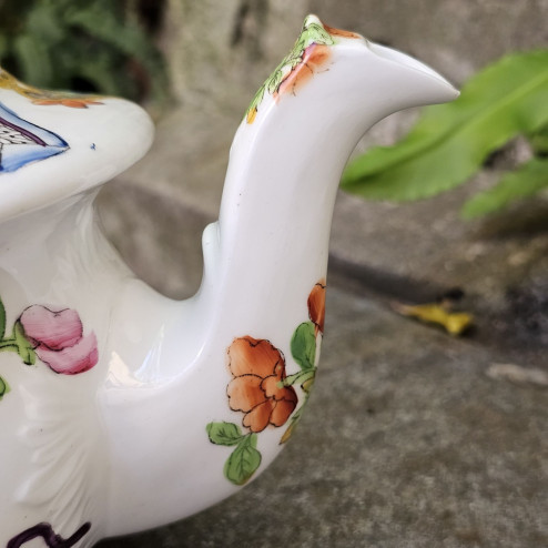 Splendida teiera inglese in fine bone china, realizzata molto probabilmente tra il 1820 e il 1840 e attribuibile alla manifattura Coalport, attiva nello Shropshire e celebre per la qualità della sua porcellana finissima.