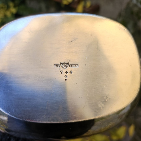Prodotta da Harrison Fisher & Co., manifattura attiva a Sheffield e apprezzata per la qualità delle sue argenterie, la teiera presenta una forma armoniosa e ben proporzionata, con corpo arrotondato, becco slanciato e coperchio bombato con pomello originale.