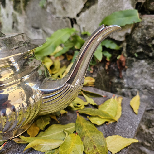 Elegante teiera inglese in Sheffield plate, prodotta tra gli anni Trenta e Quaranta del Novecento, caratterizzata da un raffinato decoro fluted che anima il corpo con una successione regolare di scanalature verticali, donando ritmo e luminosità alla superficie.