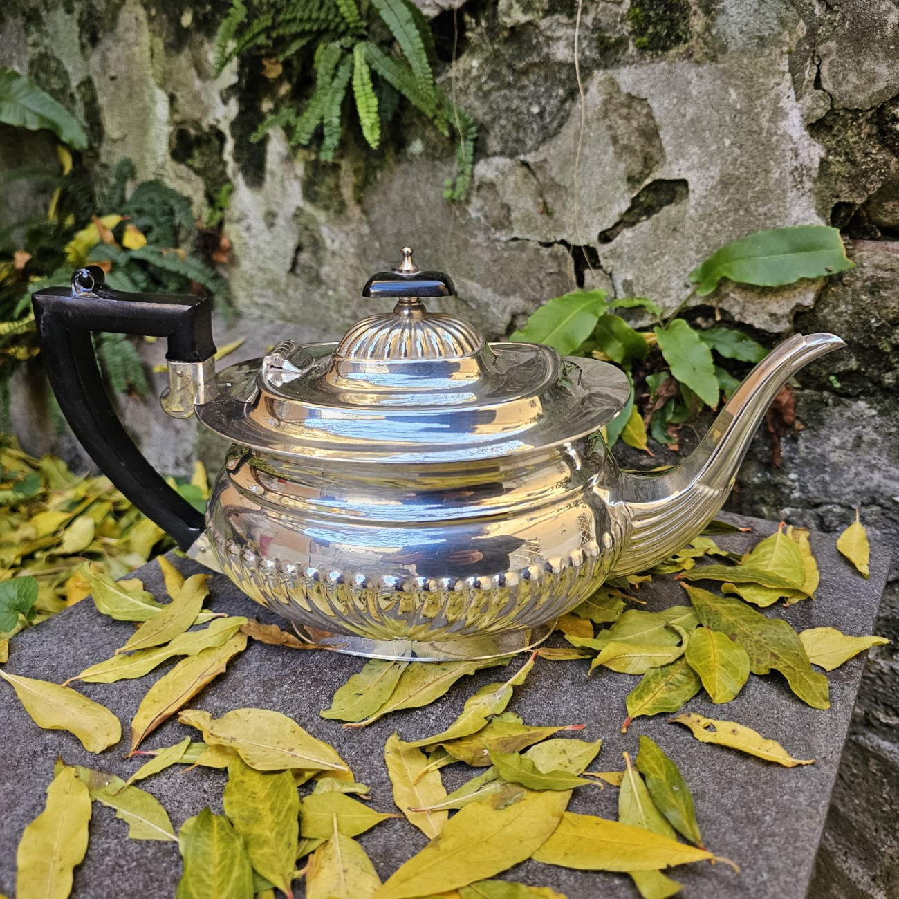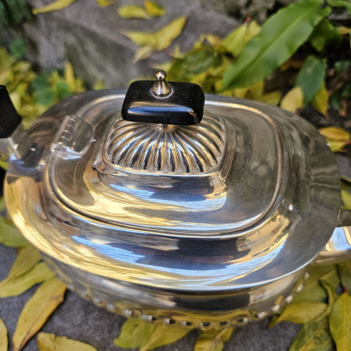 Elegante teiera inglese in Sheffield plate anni ’30–’40, con decoro fluted e manico e pomello in resina nera. Ottime condizioni.