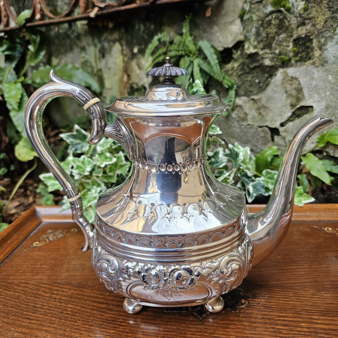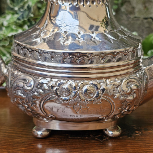 Elegante caffettiera vittoriana in Sheffield plate, realizzata come premio agricolo e incisa con dedica storica. Un raro oggetto d’epoca che unisce funzione, prestigio e racconto.