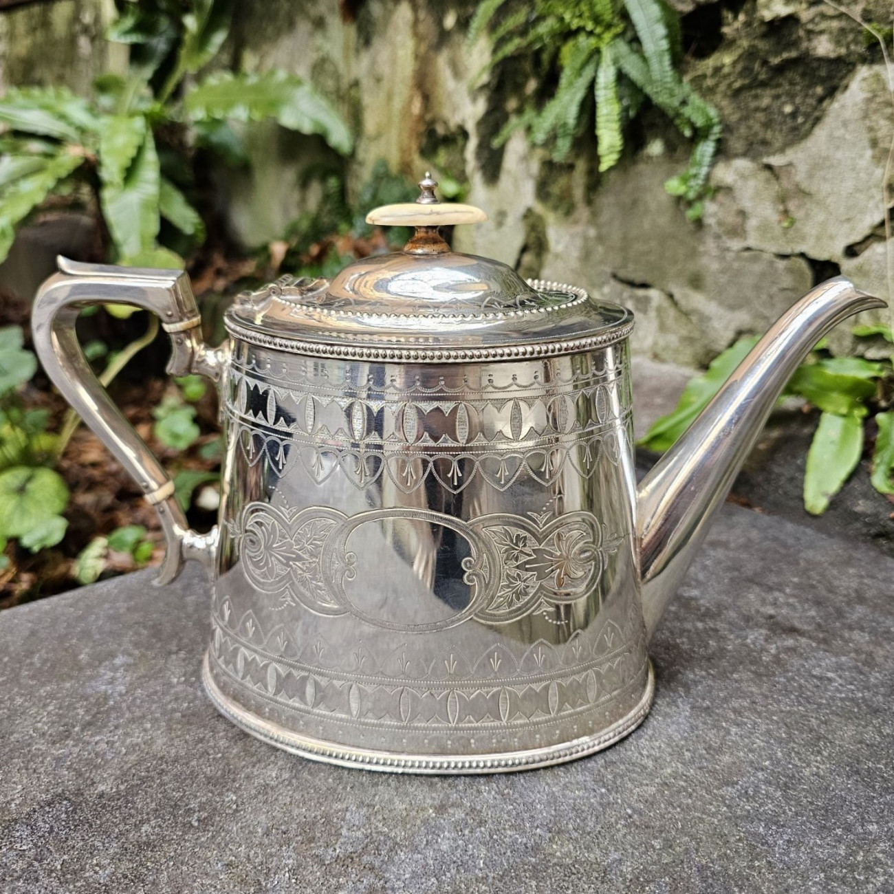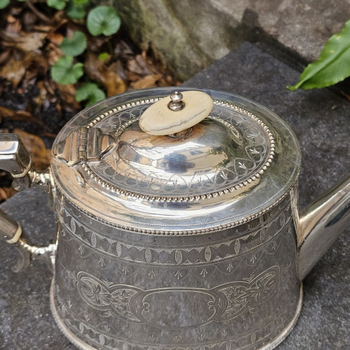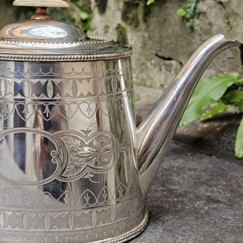 La teiera presenta una linea elegante e ben proporzionata, con corpo leggermente svasato e beccuccio slanciato. La superficie è interamente decorata da un ricco motivo inciso a mano, caratterizzato da fregi floreali, cornici ovali e motivi geometrici che testimoniano l’elevato livello artigianale tipico della produzione vittoriana.