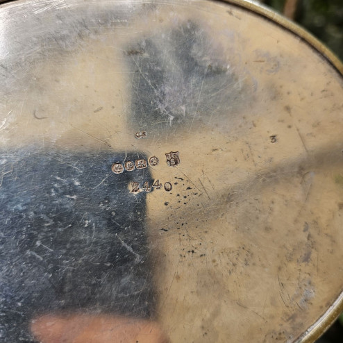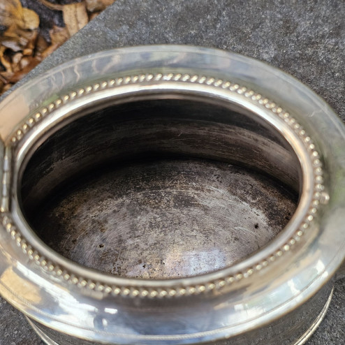 Il coperchio è completato da pomello in resina, così come i distanziatori dell’impugnatura, elementi originali dell’epoca che contribuiscono al fascino autentico dell’oggetto. Il bordo è rifinito con una delicata godronatura che incornicia armoniosamente l’intera struttura.