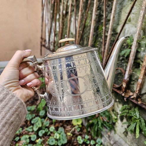 Raffinata teiera inglese antica in sheffield plate, realizzata alla fine dell’Ottocento dalla manifattura John Gilbert & Son, storica azienda attiva a Sheffield nella produzione di argenteria di alta qualità.