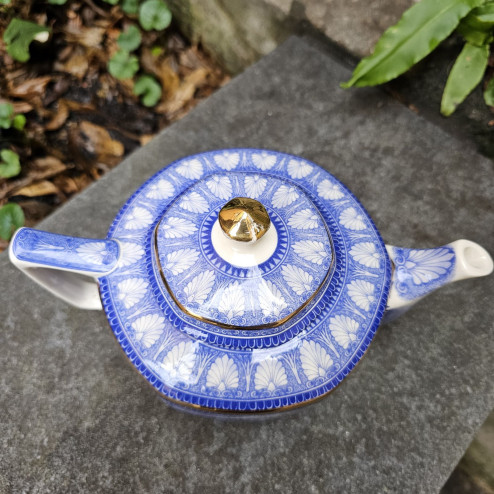 Dalla classica forma Montrose, esclusiva di Royal Albert e usata per molti decori, la teiera presenta molte rifiniture in oro, sia sui bordi che sul manico e sul pomello a forma di bocciolo.