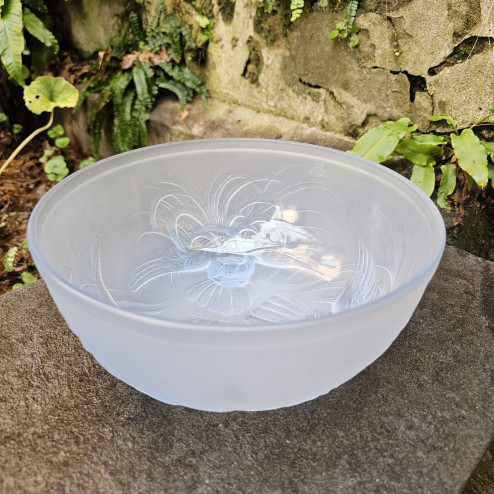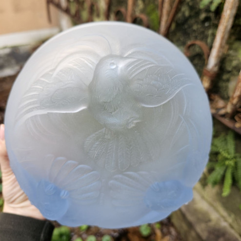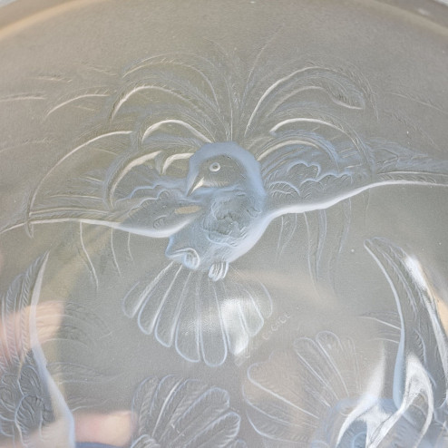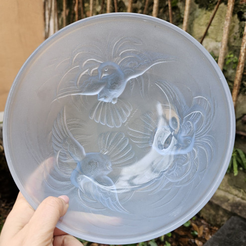 Coppa in vetro pressato opalescente color azzurro chiaro prodotta da Jobling in Inghilterra. Datata 1935, decorata con tre uccelli del paradiso in rilievo. Diametro 21,5 cm, altezza 10 cm.