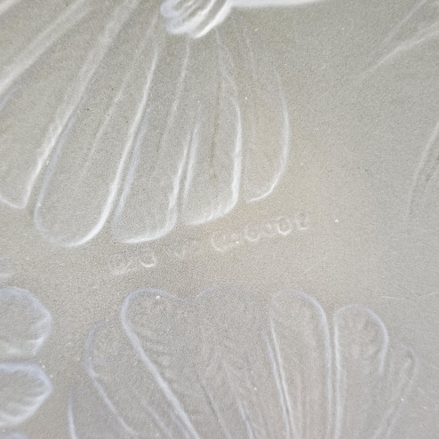 La decorazione è composta da tre eleganti uccelli del paradiso, realizzati in rilievo sul fondo della coppa: osservati dal lato inferiore appaiono scolpiti e tridimensionali, mentre dall’interno si trasformano in un delicato disegno inciso, creando un raffinato gioco di luce e trasparenze.