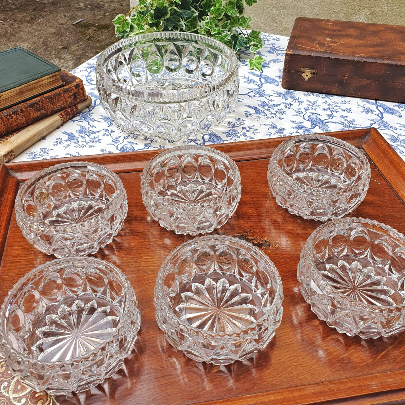 Raffinato set da macedonia inglese in vetro pressato attribuibile a Bagley, composto da una coppa grande e sei coppette individuali.