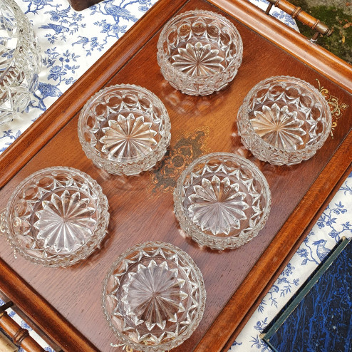 Un prezioso esempio di vetro pressato inglese degli anni '30, questo set da macedonia attribuibile alla manifattura Bagley si distingue per la brillantezza del vetro e la ricchezza del decoro geometrico. Il numero di registro impresso sul fondo risale al 1934 e ne attesta la datazione, conferendo al set ulteriore valore storico e collezionistico.