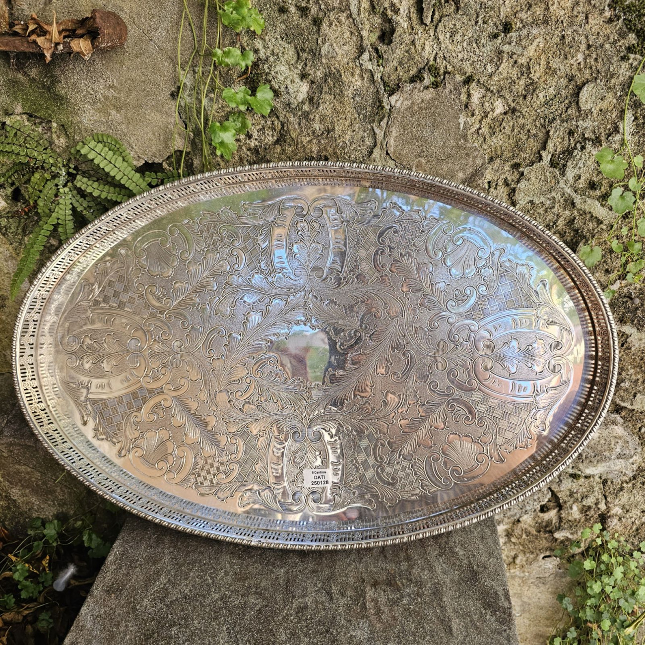 La ringhiera lavorata aggiunge un tocco teatrale tipico dello stile vittoriano.Classico vassoio rotondo inglese in silver plate.