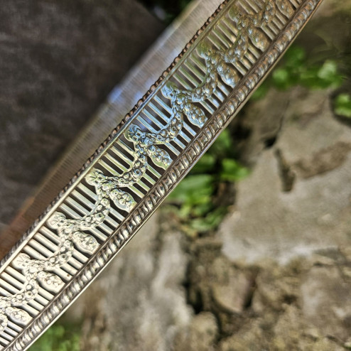 Il piano del vassoio è riccamente decorato a stampo, con un disegno floreale e a volute tipico dell’epoca, mentre il bordo, alto 2,5 cm, presenta una raffinata modanatura a balaustro completata da festoni decorativi. Una combinazione che dona solidità e raffinatezza, perfetta per il servizio oppure come elemento d’arredo.