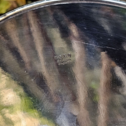 Vassoio rotondo in sheffield plate Walker & Hall, anni 1920–40, con raffinato decoro a stampo e patina autentica del tempo.