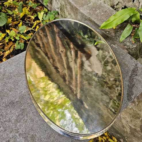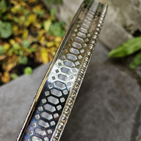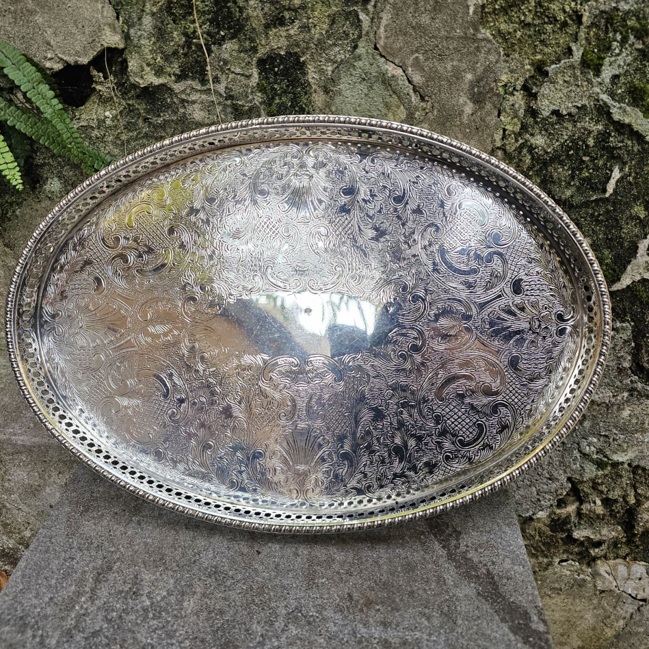 Elegante vassoio ovale inglese in Sheffield plate, prodotto negli anni ’30 da E.H. Parkin & Co. Presenta un raffinato bordo a balaustro e un formato pratico (36,5 × 25 cm). Perfetto per servire, per creare piccoli allestimenti decorativi o come base per argenti e cristalli. In buone condizioni, con normale patina del tempo.