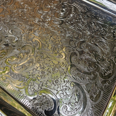 Il pezzo presenta manici laterali scolpiti, eleganti e robusti, mentre gli angoli sono arricchiti da cornici a rilievo con motivi floreali e volutati. Il piano è interamente decorato a stampo, con un’incisione fitta e preziosa che ricopre tutta la superficie interna, creando un effetto ricco e luminoso.