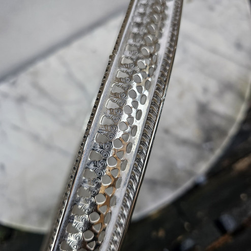 Elegante vassoio inglese in sheffield plate risalente agli anni Trenta del Novecento, un periodo particolarmente raffinato per la produzione di argenteria britannica. Il vassoio presenta un classico bordo a balaustro traforato, finemente lavorato, che incornicia una superficie centrale riccamente incisa con motivi floreali e volute di gusto tradizionale, creando un delicato gioco di luce sulla superficie argentata.