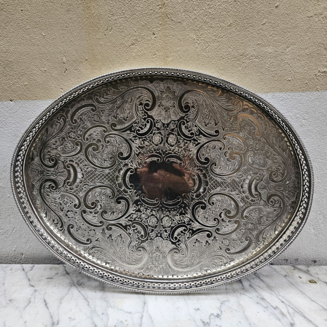 Vassoio ovale in sheffield plate inglese, anni ’30, con bordo a balaustro traforato e piedini rotondi schiacciati. Riccamente inciso, elegante e senza tempo.