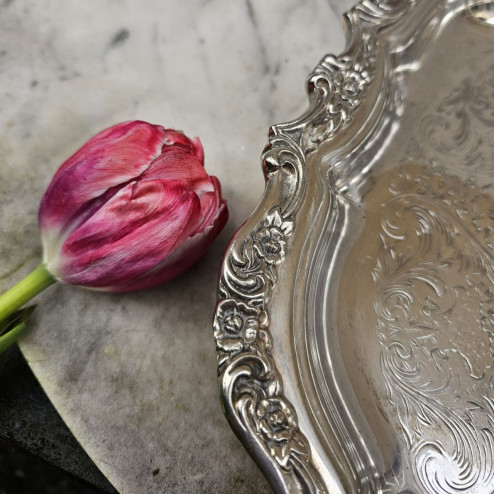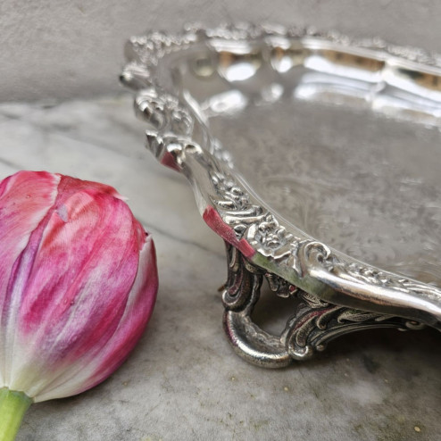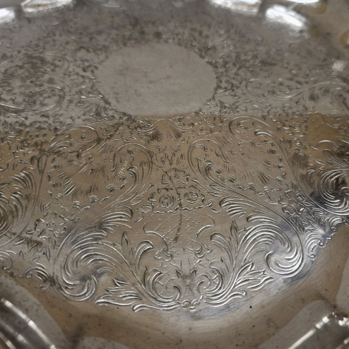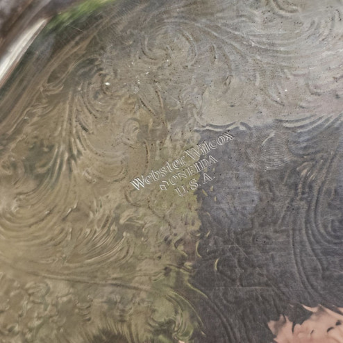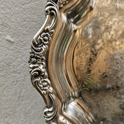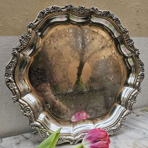 Vassoio rotondo tipo salver in silver plate, prodotto negli Stati Uniti da Webster Wilcox negli anni ’80, da considerarsi a pieno titolo un oggetto vintage. Il vassoio presenta una forma mossa molto elegante, con una cornice riccamente decorata da motivi floreali e volute in rilievo, che conferiscono grande movimento e profondità al profilo.