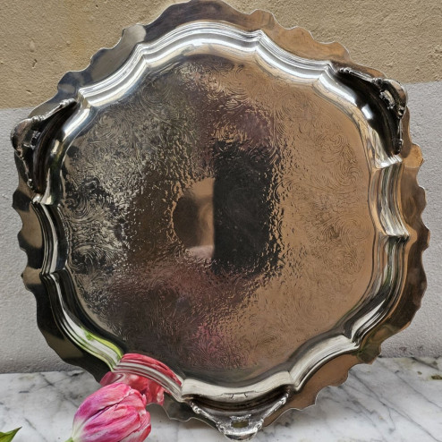 Importante vassoio rotondo “salver” in silver plate prodotto negli Stati Uniti da Webster Wilcox negli anni ’80. Forma mossa, bordo riccamente decorato e tre piedini ornamentali. Oggetto vintage molto pesante e scenografico.