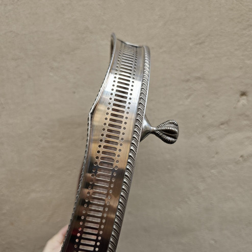 Il bordo a balaustro presenta una linea mossa e riccamente lavorata, che conferisce all’oggetto una presenza scenografica ed elegante; i manici sono incorporati