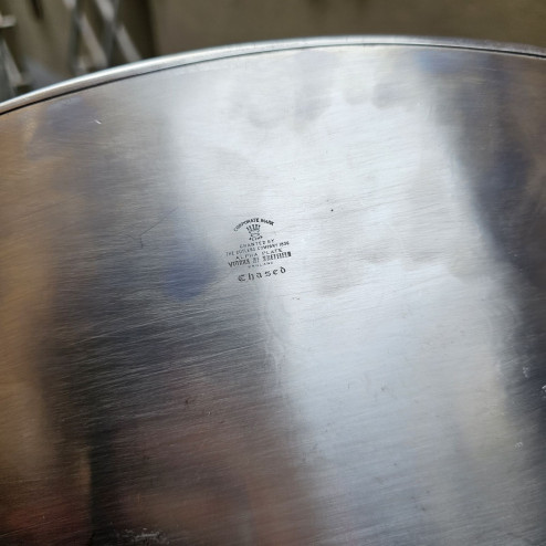 Importante vassoio rotondo “salver” in silver plate prodotto negli Stati Uniti da Webster Wilcox negli anni ’80. Forma mossa, bordo riccamente decorato e tre piedini ornamentali. Oggetto vintage molto pesante e scenografico.
