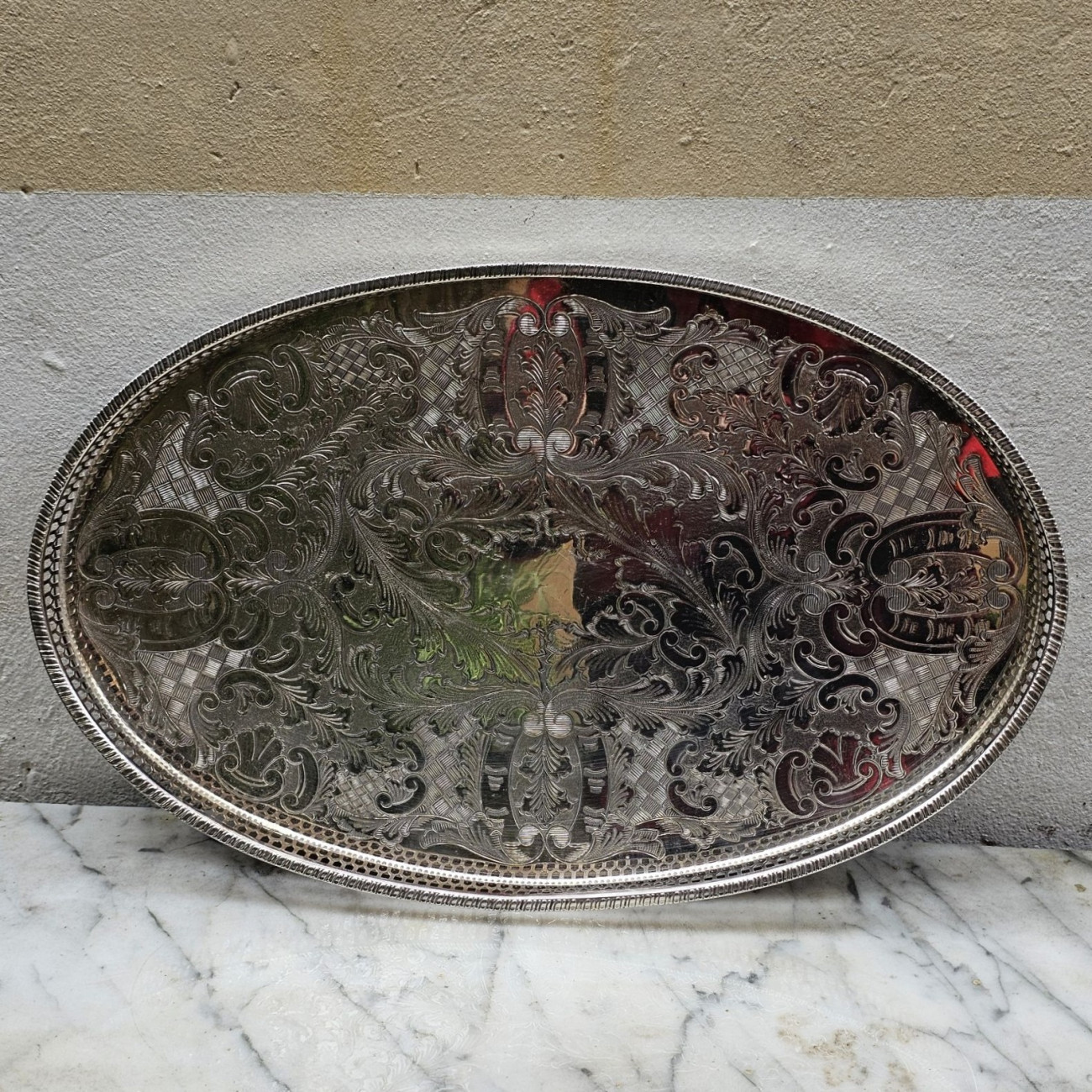 Elegante vassoio ovale in sheffield plate inglese, prodotto dalla storica manifattura Viner’s of Sheffield tra gli anni Trenta e Quaranta del Novecento.