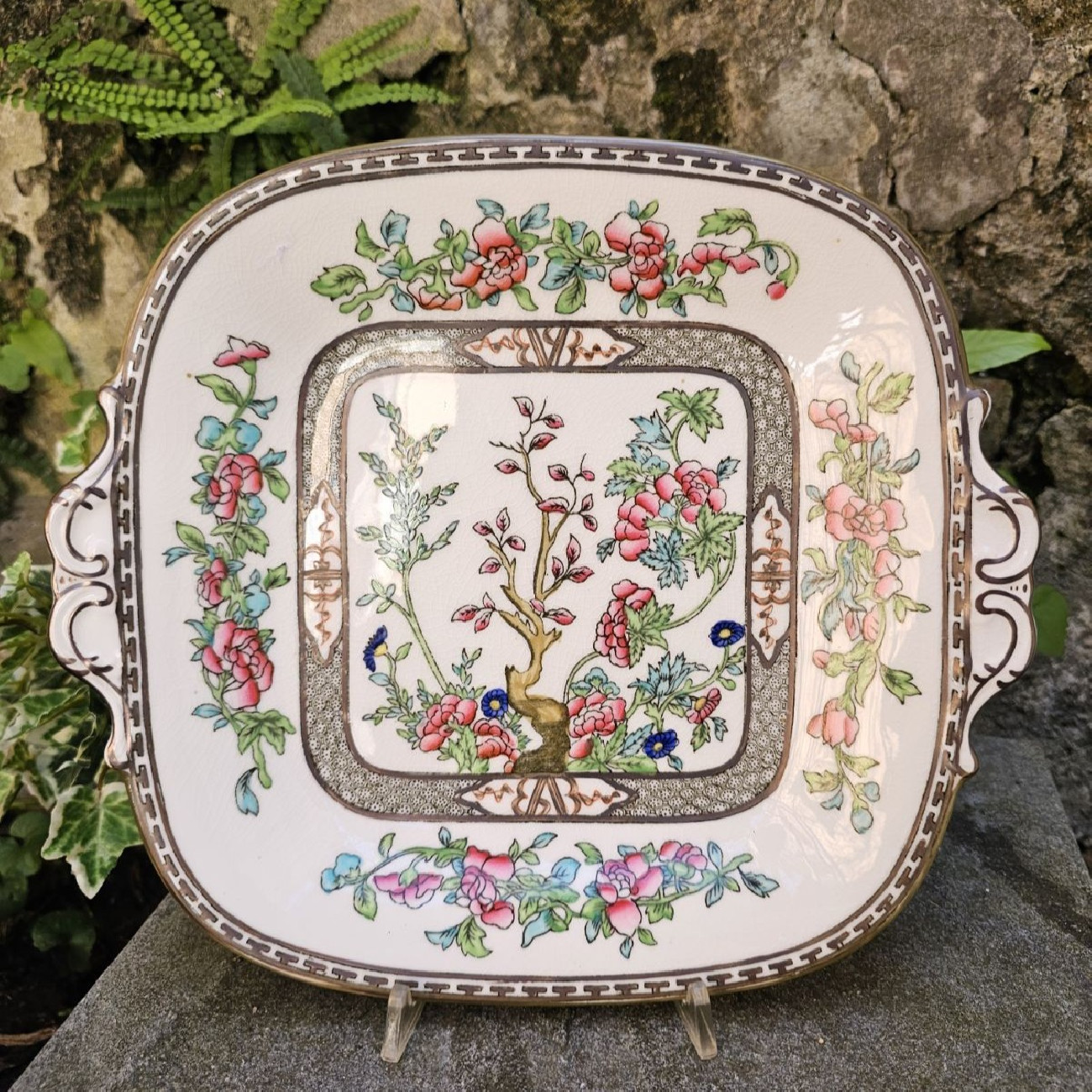 Elegante vassoietto da dolci in fine bone china, prodotto da Coalport negli anni ’20, decorato con il celebre motivo Indian Tree.