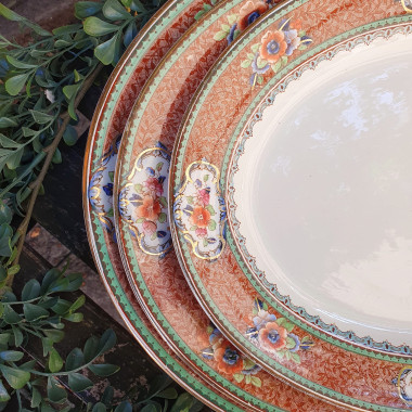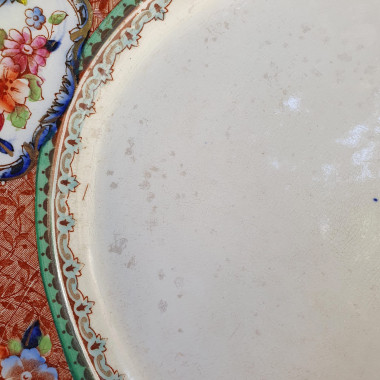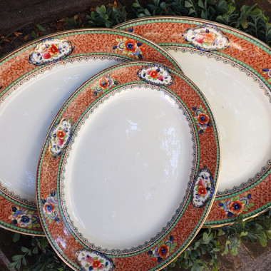 Set di 3 vassoi ovali inglesi in ceramica decorata a transferware e ripassata a mano coi tipici colori imari.