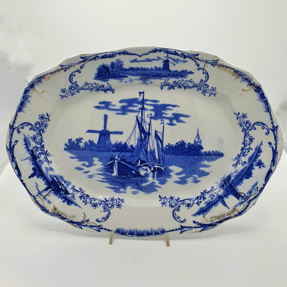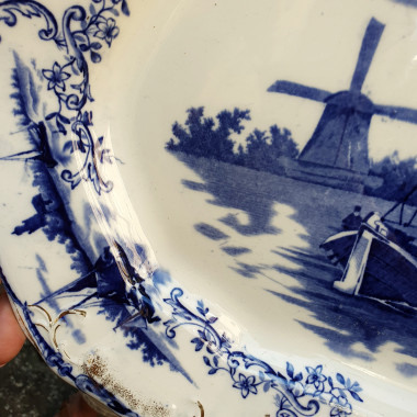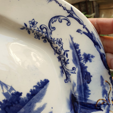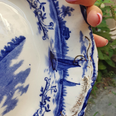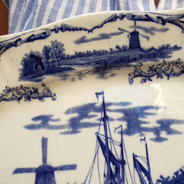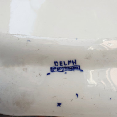 Legumiera inglese in ceramica prodotta da A.E. Jones della Palissy Pottery negli anni '40. Di forma ottagonale, è caratterizzata da un bellissimo disegno in blu di un paesaggio lacustre, e l'intensità e il contrasto dei colori ricordano quasi le porcellane di Delft. Da sottolineare la bellezza e l'unicità del pomellino e dei manici laterali anch'essi rifiniti in blu in puro stile decò.