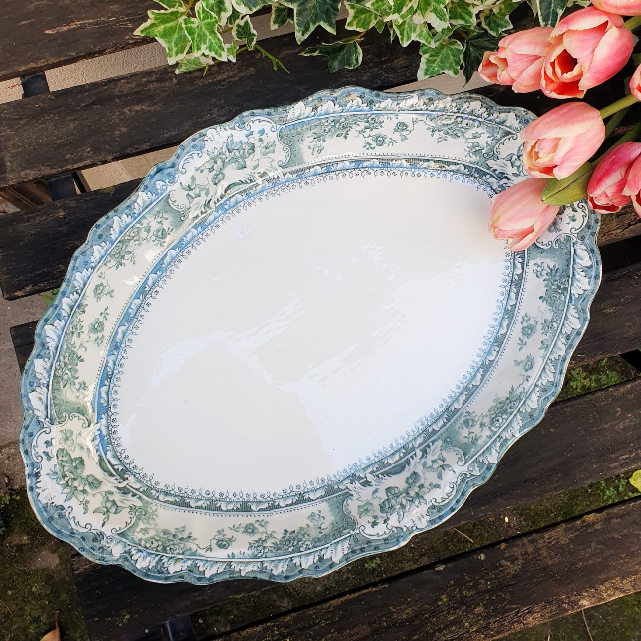 Di forma ovale con bordo mosso, è impreziosito da un elegante decoro floreale in blu-verde su fondo avorio.