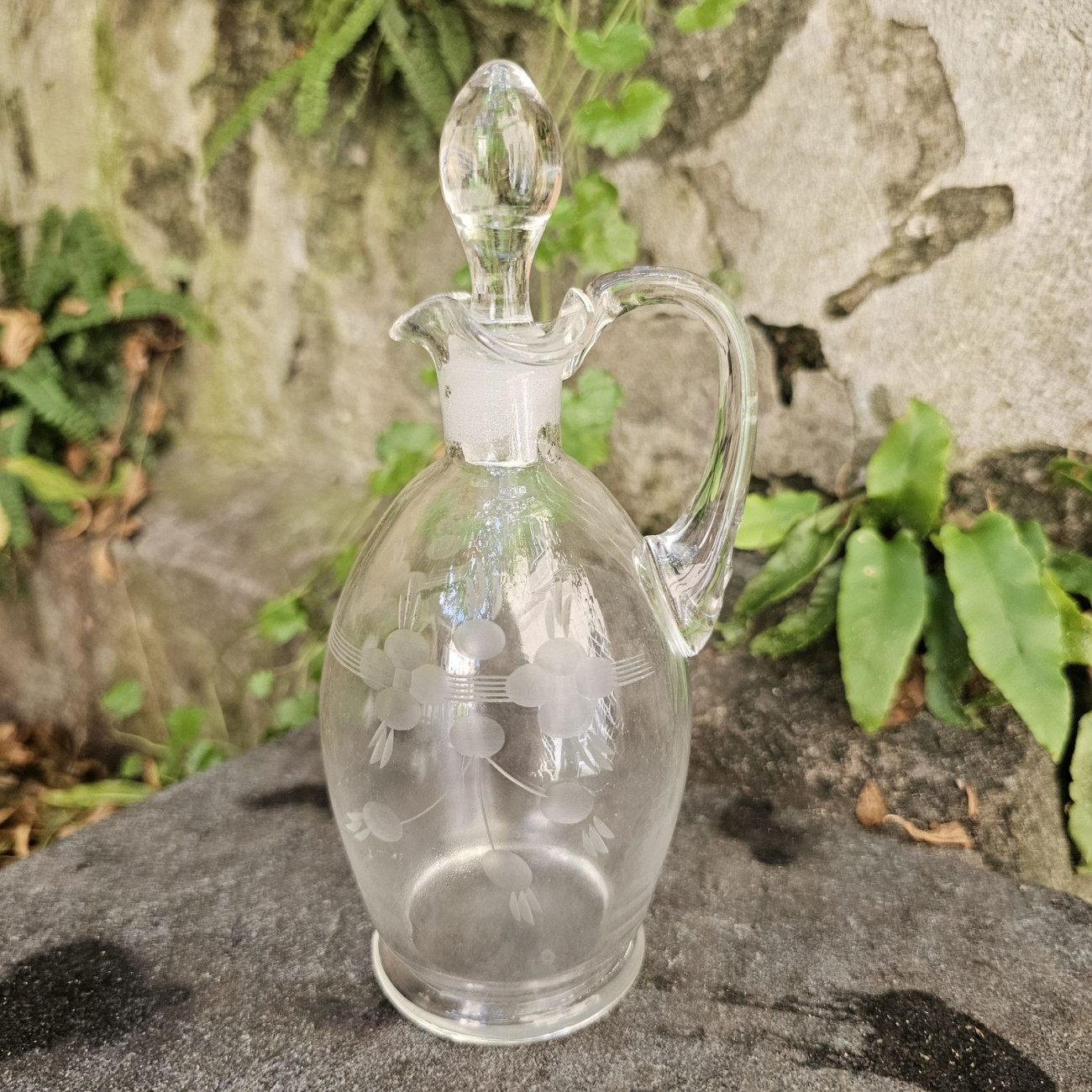 Oliera in vetro soffiato inglese della fine dell’800, dalla forma geometrica. Decorata con motivi floreali incisi, con manico attorcigliato e tappo sfaccettato.