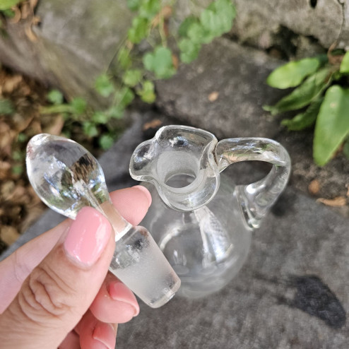 La superficie è decorata con eleganti scanalature verticali che donano leggerezza e movimento alla forma sinuosa, mentre il tappo originale in vetro leggero a forma di pera ricalca la lavorazione del corpo e completa l’insieme con armonia.