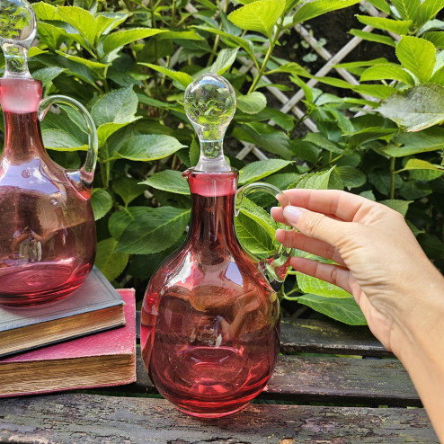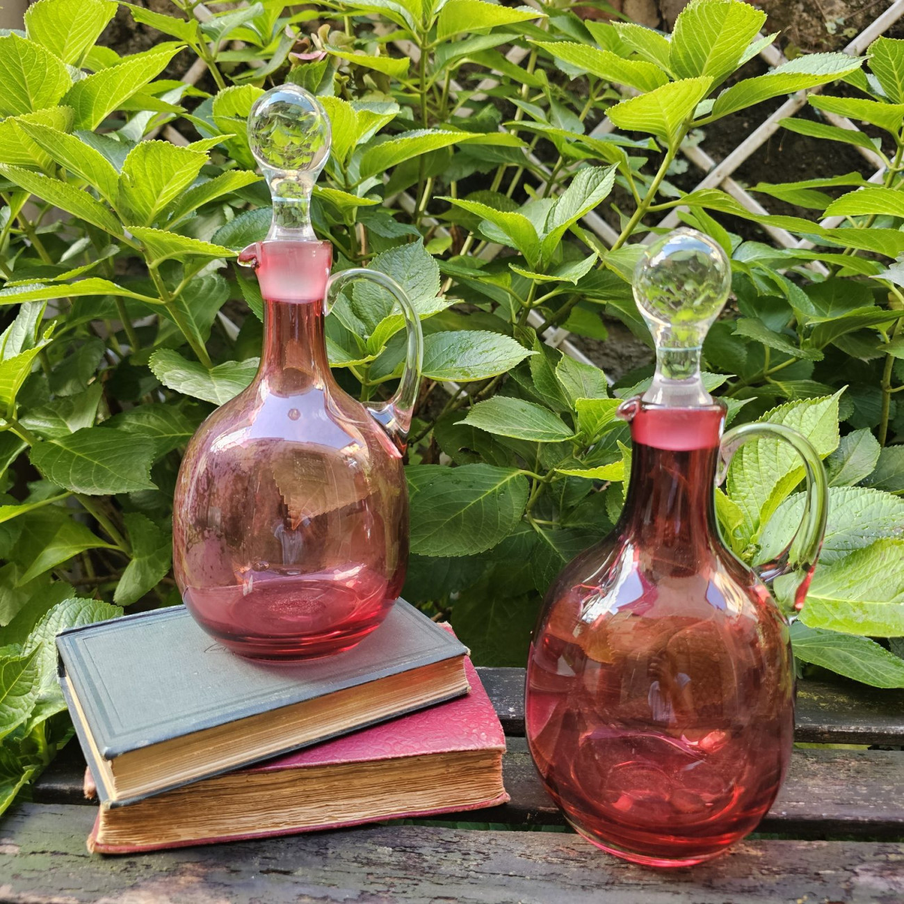 Elegante coppia di bottiglie vittoriane in vetro Cranberry soffiato con manico applicato e tappo in vetro. Raffinate e rare da trovare in coppia, perfette come pezzi da collezione o per impreziosire la tavola.