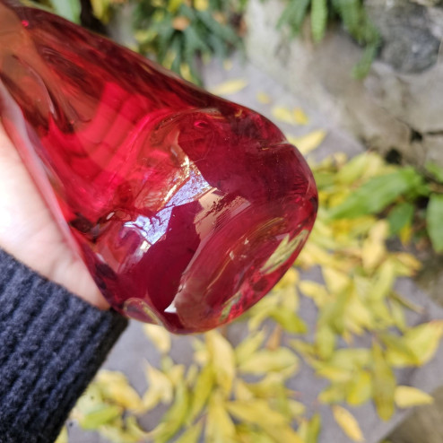 Il colore rosso rubino, profondo e luminoso, cambia intensità a seconda della luce, rendendo il vaso estremamente scenografico anche quando utilizzato come elemento decorativo a sé stante. Perfetto su una credenza, una libreria o come accento di colore in un interno contemporaneo.