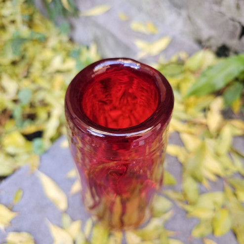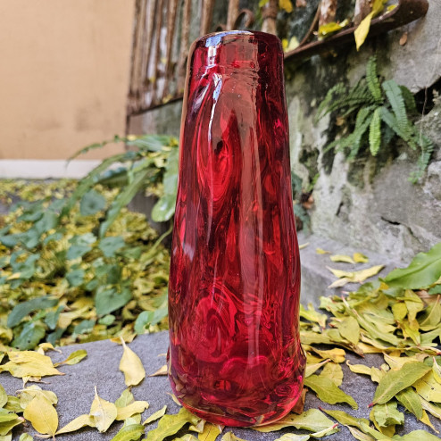 Vaso inglese in vetro soffiato color rosso rubino, prodotto da Whitefriars negli anni ’60 per la serie Knobbly, design di William Wilson e Harry Dyer. Altezza 24 cm. Ottime condizioni.